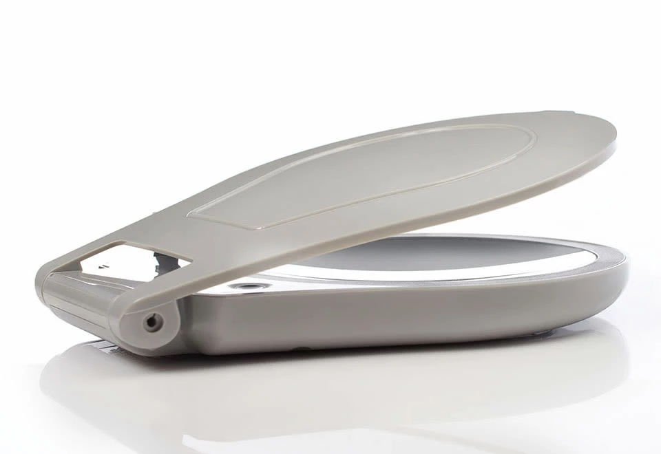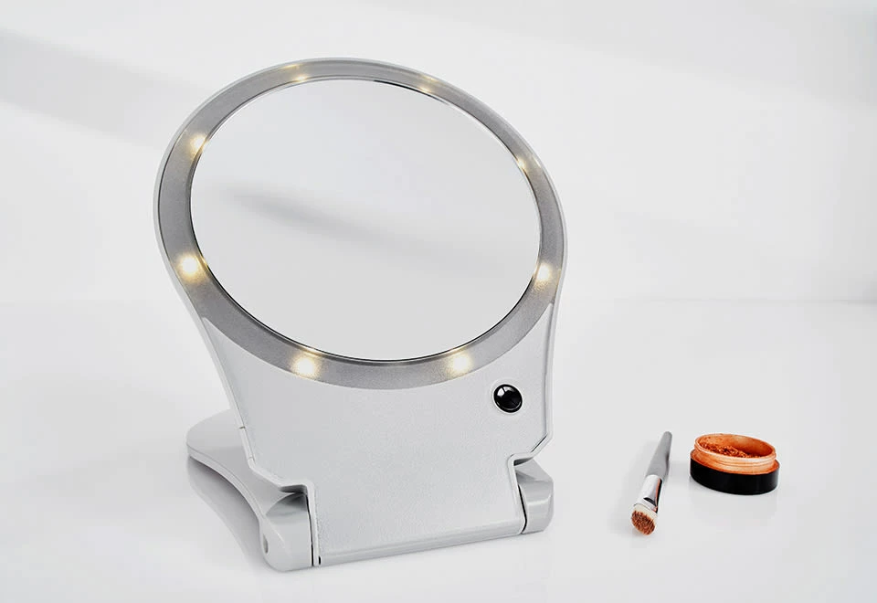 The 10X Lighted Folding Travel Mirror is the portable solution for makeup on the go. With 10X magnification, you won’t need your glasses to get a great view. The 6″ distortion-free mirror helps you see even the tiniest details, so tweezing brows and applying eye makeup is a breeze. Eight superbright LEDs illuminate your face and never need changing. The cover even flips open to become a stand, then folds down to just 1” thick.
