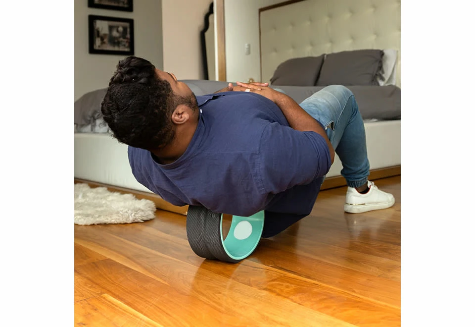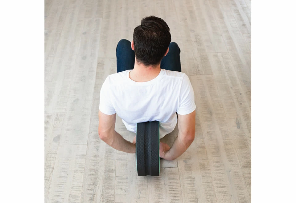 Back Pain Relieving Wheels fits perfectly between your shoulder blades to help you roll away pressure and back pain.