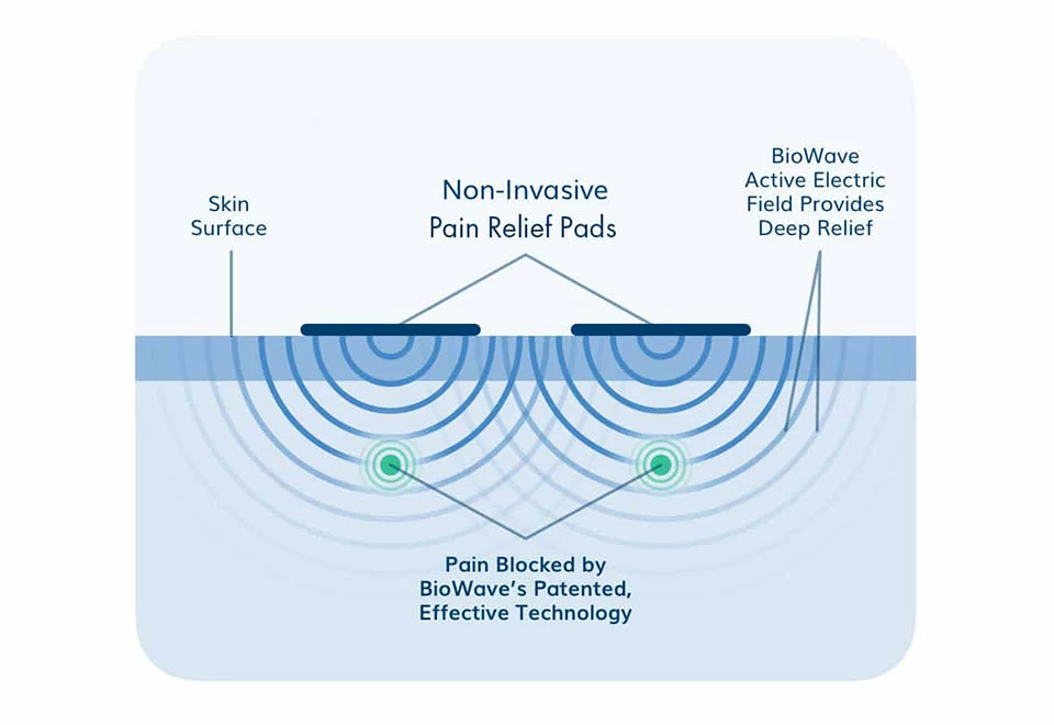 • Patented BioWave technology uses active electric fields to block pain directly at the nerve