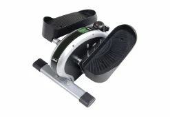 It has an LCD display that shows your number of strides per minute, total strides, exercise time, calories burned and lets you scan all stats stored in its memory. Includes LR44 battery. The Compact Elliptical Trainer features a sturdy steel frame that supports up to 250 lbs; some assembly is required.