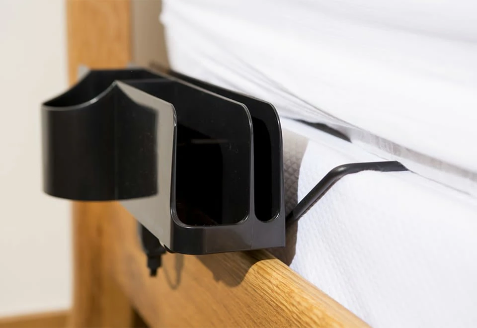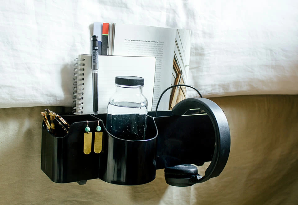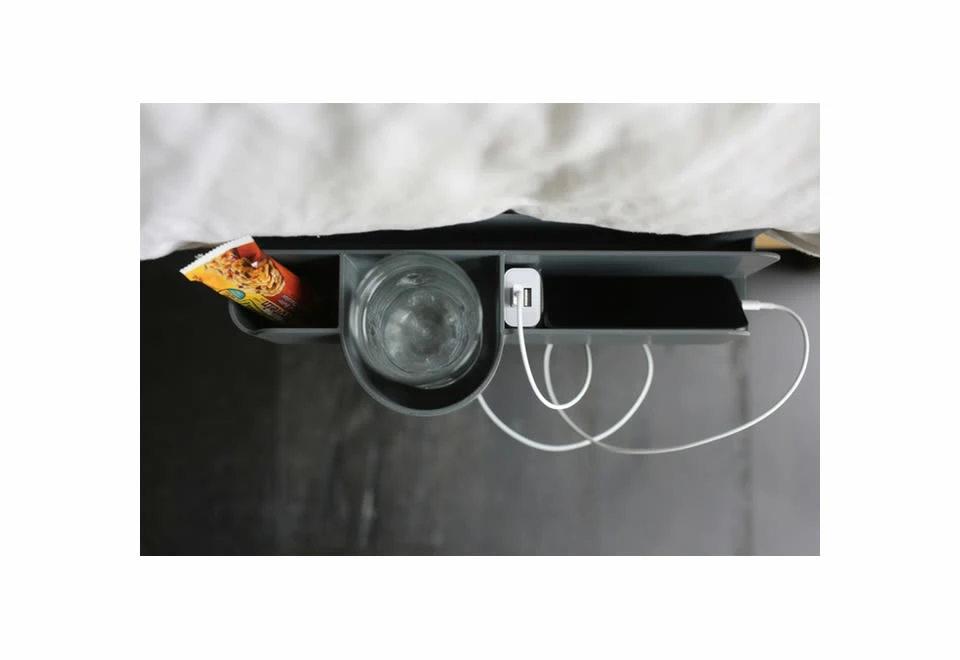 The Deluxe Bedside Organizer is perfect for dorms, apartments and other small spaces. It keeps your nighttime essentials within arm’s reach, and even charges two mobile devices while you sleep.
