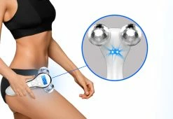 The EMS Rolling Massager combines Electrical Muscle Stimulation (EMS), high-frequency vibration and blue light therapy to help improve skin health and muscle tone.